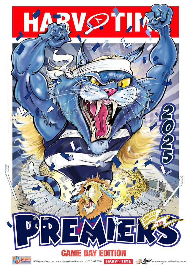 Celebrate the Cats 2025 Premiership with this great limited edition poster by artist Paul Harvey.