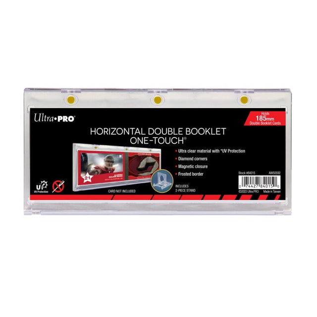 Ultra PRO’s ONE-TOUCH holders are premium trading card storage cases Designed as the final destination for your booklet cards, our two-piece ONE-TOUCH holders are uniquely designed with slide-in hinge and triple-tight magnetic closure. The holder provides UV-resistant, no-PVC and acid free protection to ensure your valuable hit retains its condition while under display. Our ONE-TOUCH booklet holder comes with a minimalist two-piece display stand with an adjustable viewing angle. This model can hold horizontal double booklet cards that opens up to 185 millimeters in length.