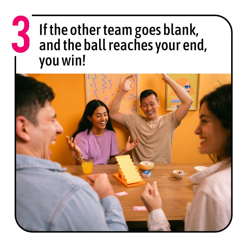 A back and forth, shouty-outy party game for two teams. Both teams have to shout out answers to the same category in turn. If a team goes blank, and can't think of an answer in time, the other team captures the ball and wins the round. But watch out, this game comes with underdog comeback technology, so the better you do, the harder it is to win.
