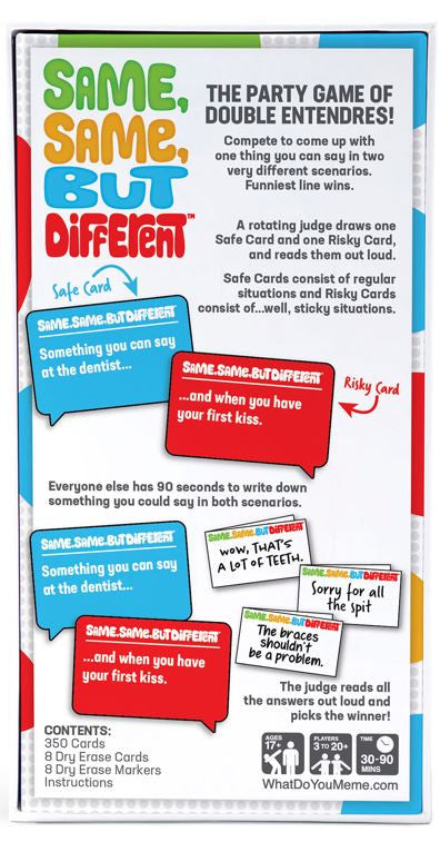 Looking to put your pun-tastic wordsmithing skills (or immature mind) to the test? Sounds like it's time for Same Same but Different, the party game of ridiculously funny double entendres! Setup is simple: Players draw a ''Safe" Card and a "Risky" Card, and compete to find the funniest phrase that suits both situations. This card game is perfect for those who are great at making jokes about the spicy parts of life... even when they probably shouldn't. Bring Same Same but Different to your next housewarming gathering, bachelorette party, friend group hang out, or any other fun event you have planned! Brought to you by What Do You Meme?
