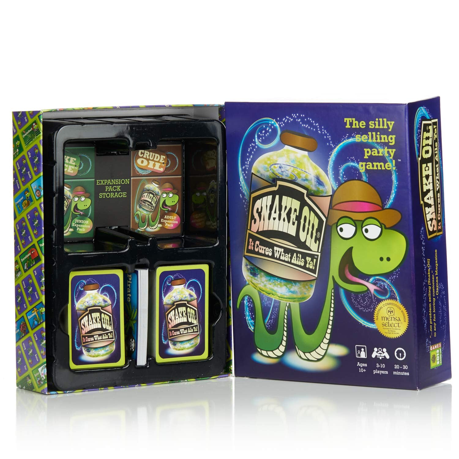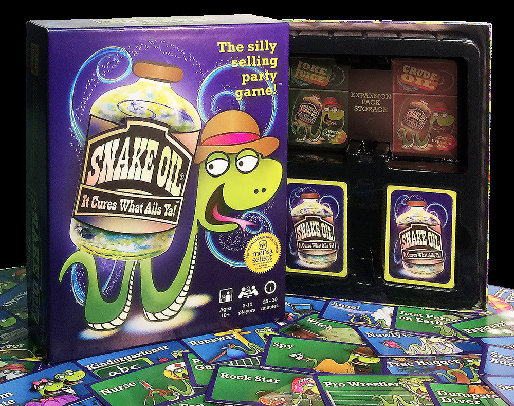 AWARD-WINNING: This National Mensa Competition Winner is sure to become a classic. Fast gameplay and simple rules make Snake Oil the perfect party game.