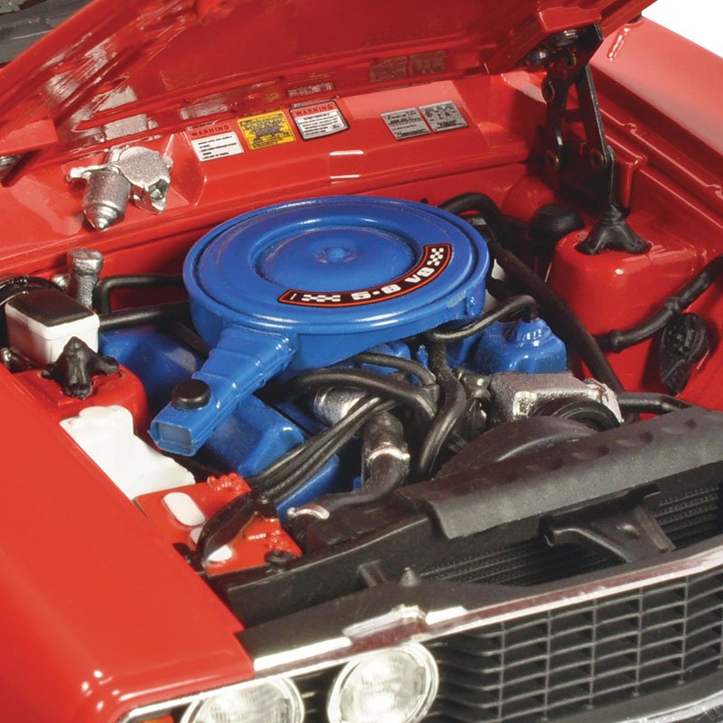 Raising the bonnet with the etch metal hinges, displays the highly detailed Cleveland 5.8L (351ci) V8.