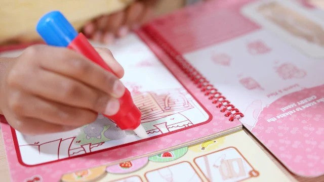 - Chunky-sized water pen is easy to fill, easy to hold, and stores in the compact, spiral-bound book, a great mess-free travel activity