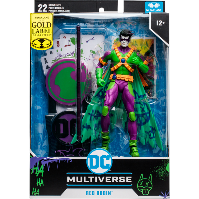 • Includes Jokerized accessories: 4 playing cards, collector card holder and base. Red Robin also comes with his Bo Staff