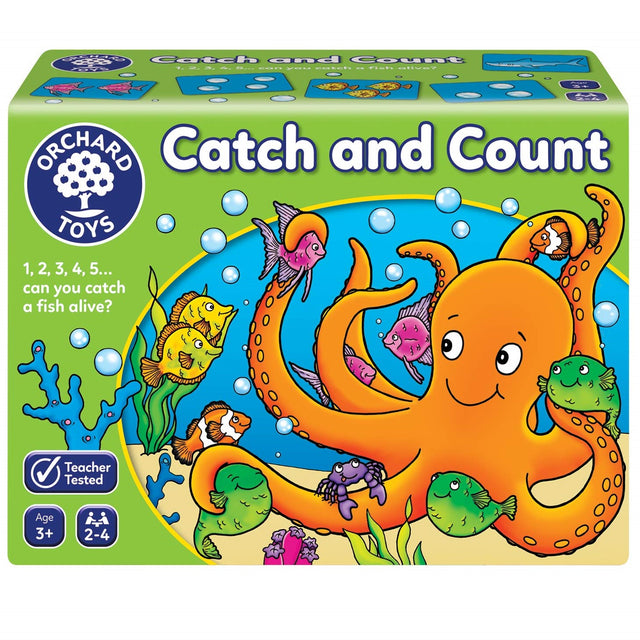 Spin the octopus spinner to see how many fish you can catch, but do take care...there's a shark out there! Spin the spinner, count the number of bubbles and collect the matching cards on your fish board. But watch out! If you turn over a shark card, it will eat all of your fish and you'll have to start again! The player with the most fish at the end of the game is the winner!