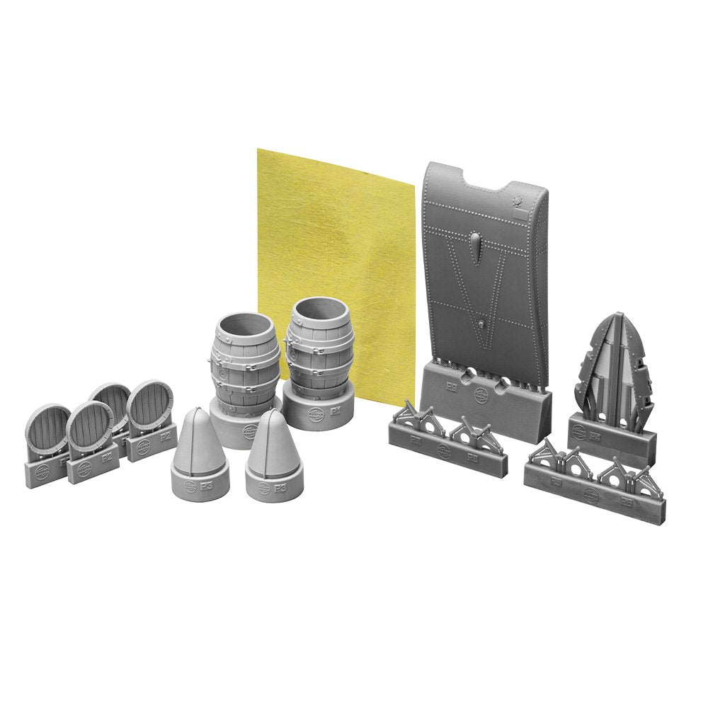 Also included are some additional resin parts, essential for enhancing the story of your model. These include two beer barrels with lids, two nose cones, two bomb racks and a slipper tank.