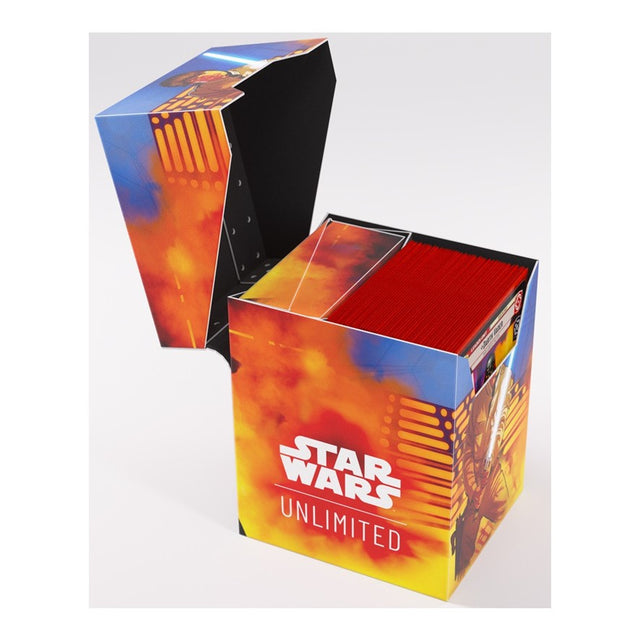 Our Star Wars: Unlimited Soft Crate is the all-in-one casual solution for Star Wars: Unlimited players. This full color printed and officially licensed deck box is packed with ingenious features. It protects a full double-sleeved deck of cards and includes an innovative token box! This token box has a smart click-lock mechanism to keep all tokens safely stored - even while pulling it out. Once opened, the lid of the box stays upright for convenient access during gameplay.