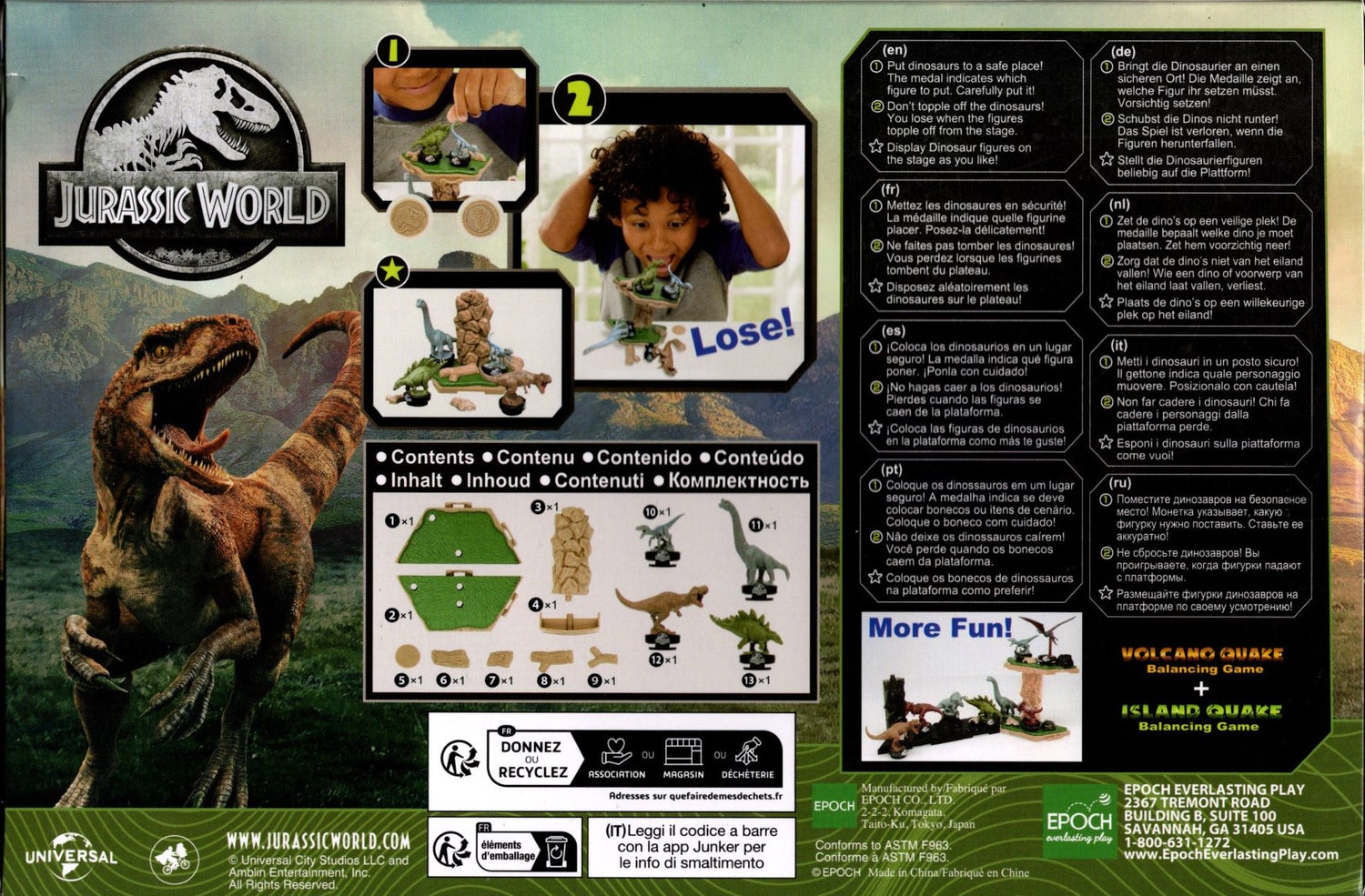 From EPOCH Games! Balancing Game with Jurassic World themed stage and dinosaur pieces! Jurassic World Island Quake is a simple balancing game. Toss the medal and move the figure or the branch piece onto the stage. Be careful not to topple off the pieces from the stage!4 Jurassic World Dinosaur figures are included.