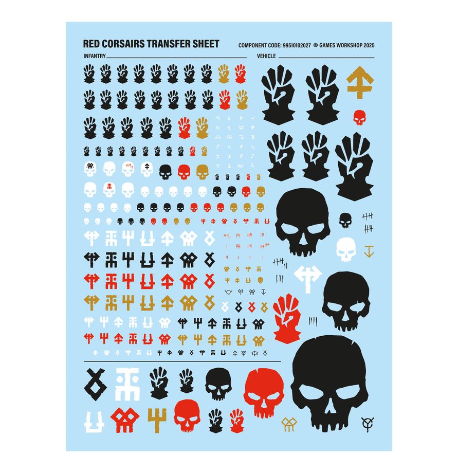 This box also includes 1 Red Corsairs Transfer Sheet, featuring 248 high-quality waterslide transfers. These include a selection of infantry and vehicle-sized transfers depicting Red Corsairs iconography, skulls, kill tallies, and other cursed sigils.
