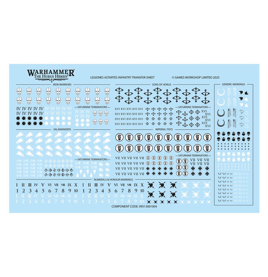 This kit is supplied with 1x Horus Heresy Transfer Sheet, containing 618 high-quality waterslide transfers to decorate your miniatures. There is Legion iconography for the Sons of Horus, Imperial Fists, Iron Warriors, and Salamanders, along with generic icons, numerals, and honour markings.