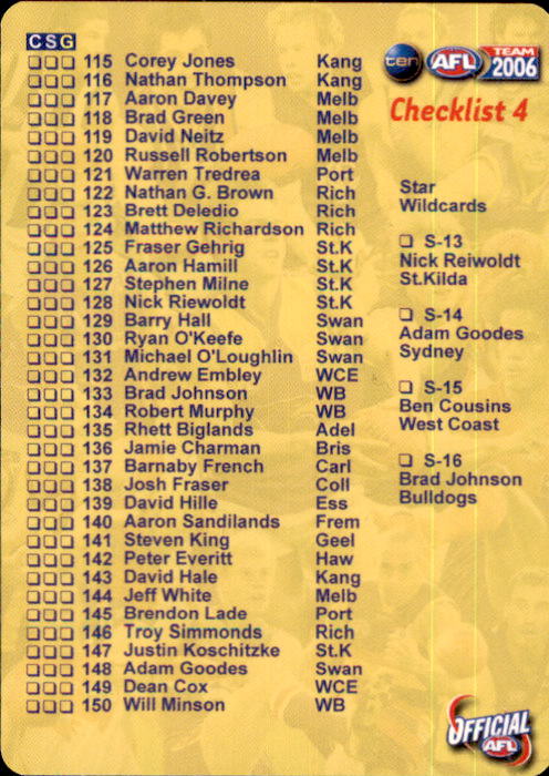 Checklist 3 & 4 (on 1 card), Silver, 2006 Teamcoach AFL