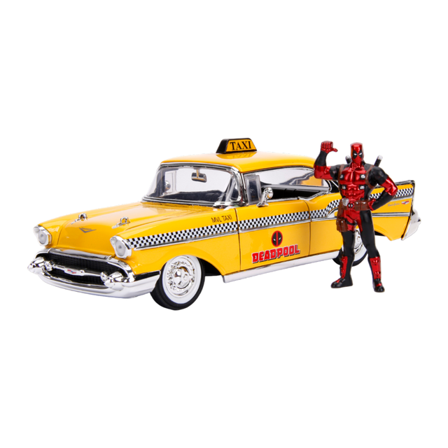 How does the Merc with a mouth get around town? With his own, personalized Dead pool taxi! Featuring opening doors, trunk and hood, this 1: 24 Chevy bel-air taxi will be a standout in any dead pool collection. Includes a 100% die-cast 2. 75" dead pool figure with a special candy-red colorway.
