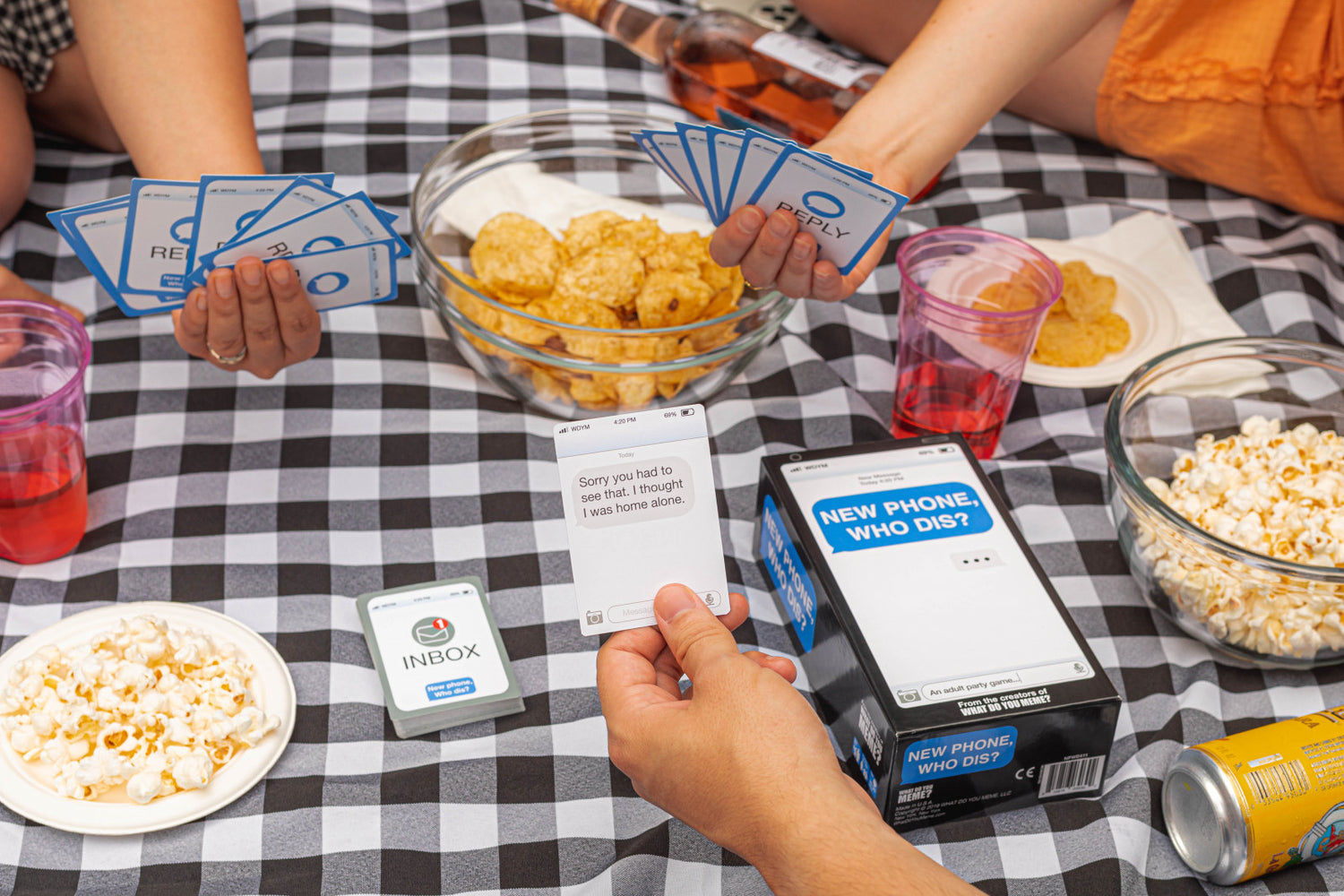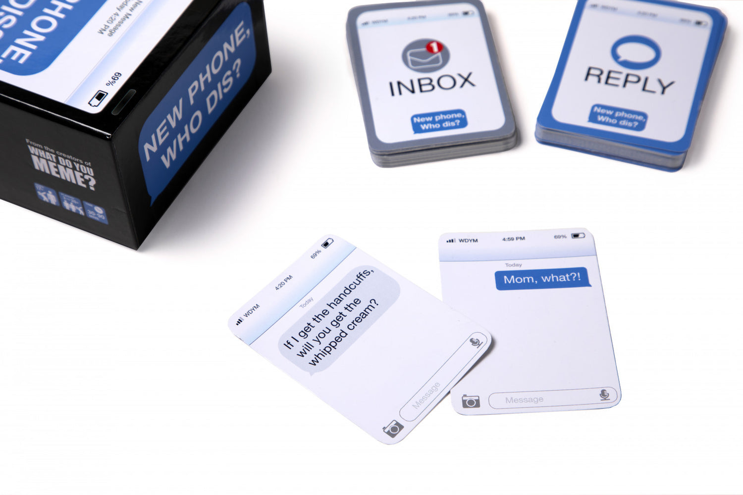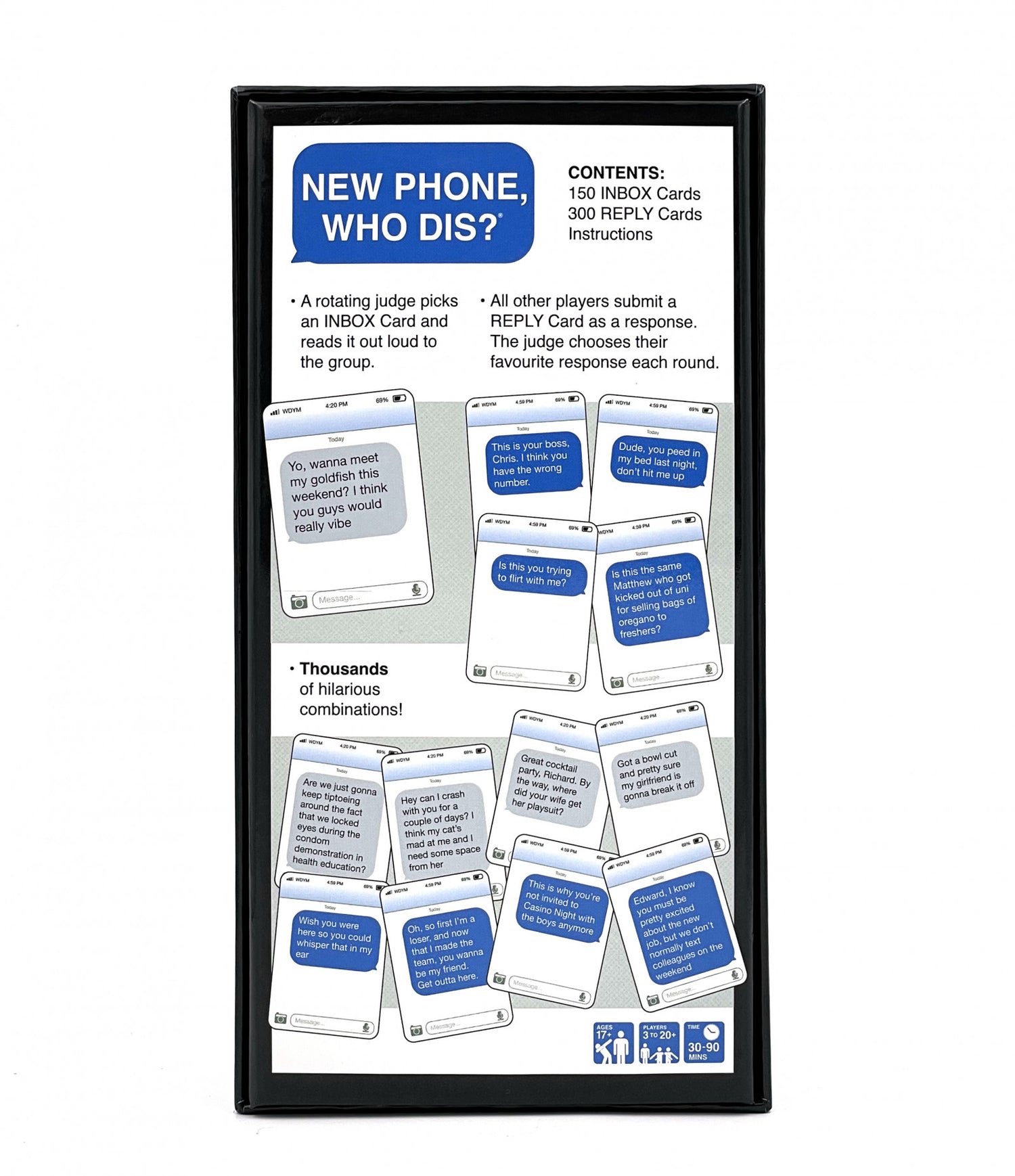 Players rotate drawing a sent (or “inbox”) card while the rest of the group competes to play the funniest reply card. Once everyone in the group has played their chosen reply card, the judge decides which combo is the funniest. That person gets a point. At the end of the game, the player with the most points wins!
