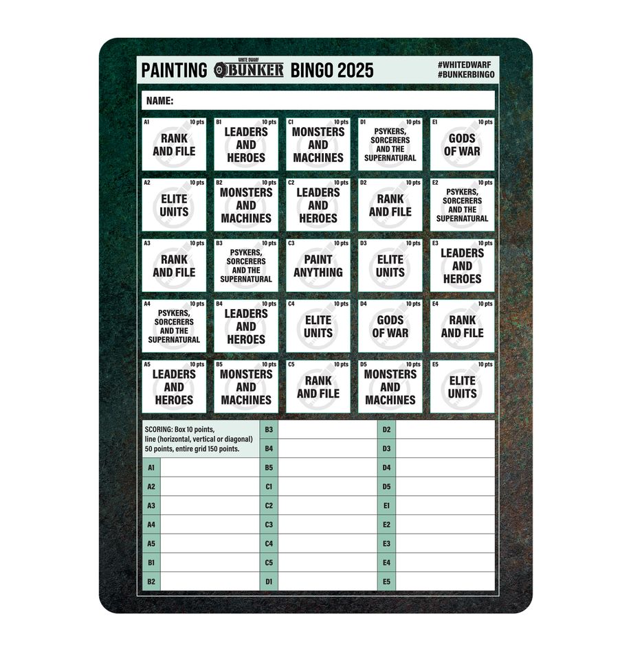Each copy of White Dwarf 507 also comes with a cardboard insert that includes a double-sided card for the Warhammer 40,000 and Warhammer Age of Sigmar Scenarios of the Month, six double-sided Warhammer Underworlds cards, a Bunker Bingo 2025 Card, 24 Genestealer Cults Ability Tokens, a Paint Recipe Card, and a Bunker Achievement Card.